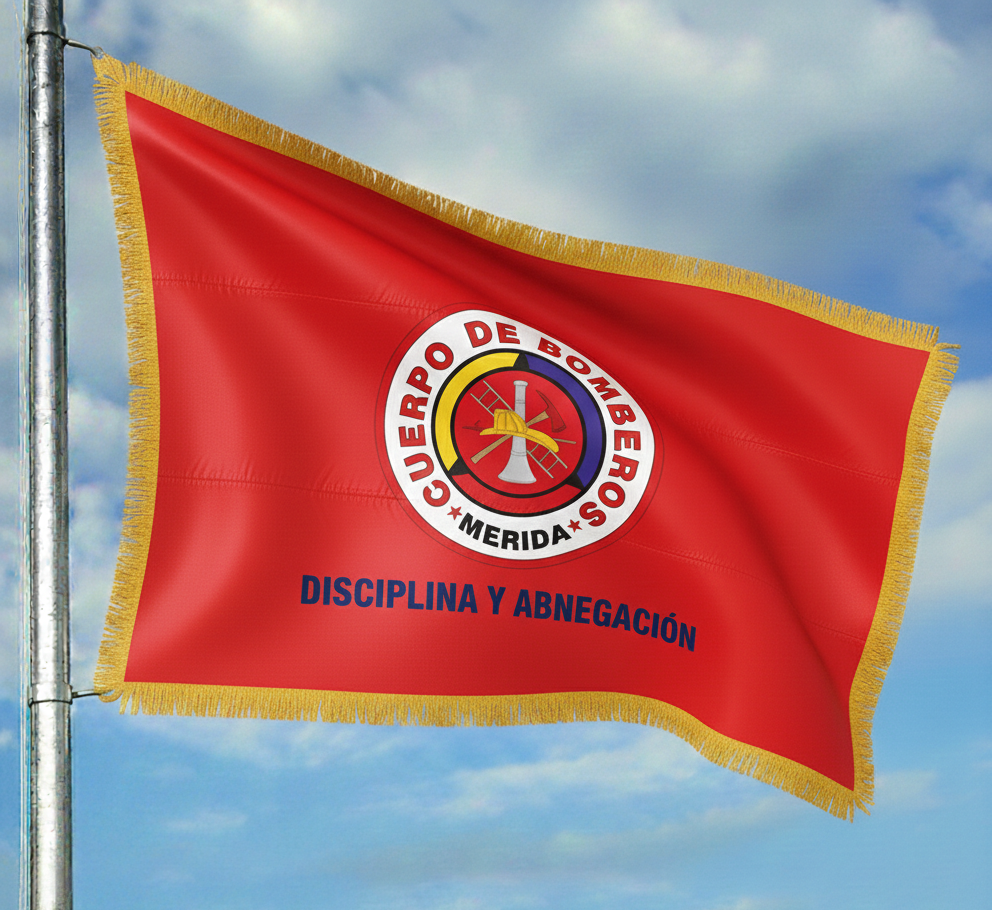 Flecos Dorados: El estandarte se encuentra orlado en sus tres bordes libres por flecos de oro, elemento que le confiere el carácter de Enseña de Gala. Estos simbolizan la nobleza de los ideales institucionales, la sabiduría en el servicio y el alto honor que representa portar los símbolos del Cuerpo de Bomberos del Estado Mérida. II. Elementos Heráldicos El Escudo de Armas: Ubicado en el centro geométrico del paño, el escudo actúa como el corazón de la bandera, otorgándole legitimidad e identidad técnica. El Lema Institucional: En la parte inferior, resaltado en letras de color azul oscuro, se lee la máxima: "DISCIPLINA Y ABNEGACIÓN". Disciplina: Representa el orden, la obediencia a la jerarquía y el entrenamiento riguroso. Abnegación: Simboliza el sacrificio altruista y la voluntad de anteponer el bienestar del prójimo al propio. III. Simbolismo Integral: El Espíritu del Bombero Merideño El estandarte, en su conjunto, no es solo una insignia de identificación; es la representación física del juramento de servicio que cada funcionario hace a la sociedad merideña. Al ondear, este símbolo amalgama la historia, el sacrificio y el futuro de la institución: Identidad y Pertenencia: El Escudo de Armas en el centro actúa como el núcleo de conocimiento y fuerza, recordando que el bombero es un técnico del riesgo que domina el fuego y el rescate mediante sus herramientas y su valor. La Unidad en el Sacrificio: El campo de gules (rojo) que abraza todo el diseño representa la hermandad de sangre de quienes comparten el peligro. Es el recordatorio de que ningún bombero actúa solo, sino bajo el amparo de una institución centenaria. La Guía Ética: El lema "DISCIPLINA Y ABNEGACIÓN" al pie del estandarte sirve como brújula moral. La disciplina asegura la eficiencia en el caos, mientras que la abnegación garantiza que el bombero siempre estará allí cuando la vida de un ciudadano esté en peligro, sin importar el riesgo personal. Honor y Respeto: Los flecos de oro que enmarcan la bandera elevan la labor cotidiana a una categoría de honor sagrado, simbolizando que ser bombero en Mérida es una de las misiones más nobles que un ciudadano puede ejercer. Este estandarte es el faro de esperanza para la comunidad y el orgullo de identidad para el funcionario. Bajo estas telas, se protege la vida, el patrimonio y el medio ambiente de nuestra región, portando con honor el nombre Cuerpo de Bomberos de Mérida ante la nación.
